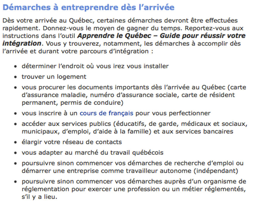 Selon Le Petit Robert 2014, le mot intégration signifie : « Opération par laquelle un individu ou un groupe s’incorpore à une collectivité, à un milieu (opposé à ségrégation). » Il est beau dire qu’il faut s’intégrer, mais comment faire lorsqu’on ne connaît personne ou qu’on ne parle même pas la langue du pays ? Le ministère de l’Immigration, de la Francisation et de l’Inclusion (MIFI) incite les immigrants à s’intégrer dès leur arrivée. Sur leur site Internet : http://www.immigration-quebec.gouv.qc.ca/fr/immigrer-installer/travailleurs-permanents/integration/, on propose les démarches suivantes :