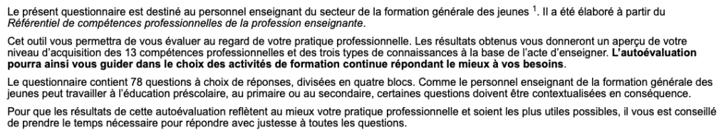 Ministère de l’Éducation. (2024). Questionnaire d’autoévaluation pour le personnel enseignant. Récupéré le 29 août 2024, de https://formulaires.education.gouv.qc.ca/collecteinfo/856_quest_aut_pour_persn_ensei/fr