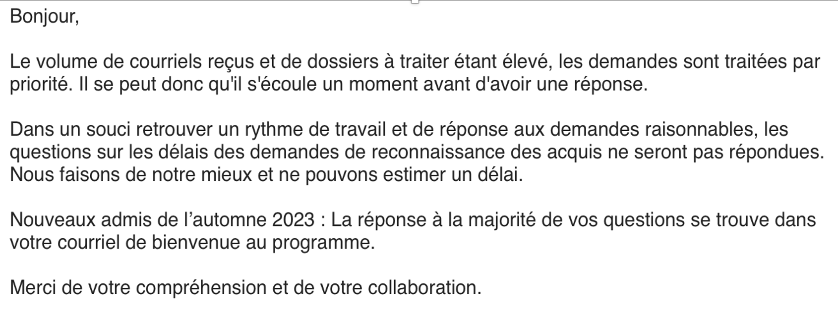 | 7 août 2023 | Bien évidemment, aucune réponse à mes courriels durant l’été. Congé estival s’impose… La rentrée est dans moins d’un mois et le rapport d’évaluation n’a pas encore été complété pour savoir à quels cours je devrais m’inscrire. J’écris donc à la responsable de mon dossier à la Gestion des études que, compte tenu du délai inattendu pour l’étude de mon dossier (« surcharge de travail en raison de la grève des professeurs qui a duré presque 5 semaines »), je pense reporter mon retour aux études à l’hiver 2024. Tant que mon dossier n’ait pas été analysé et traité, je ne peux pas entamer le processus de reconnaissance des acquis scolaires (RAS) ni extrascolaires (RAE). Voici la réponse obtenue : ![]() |