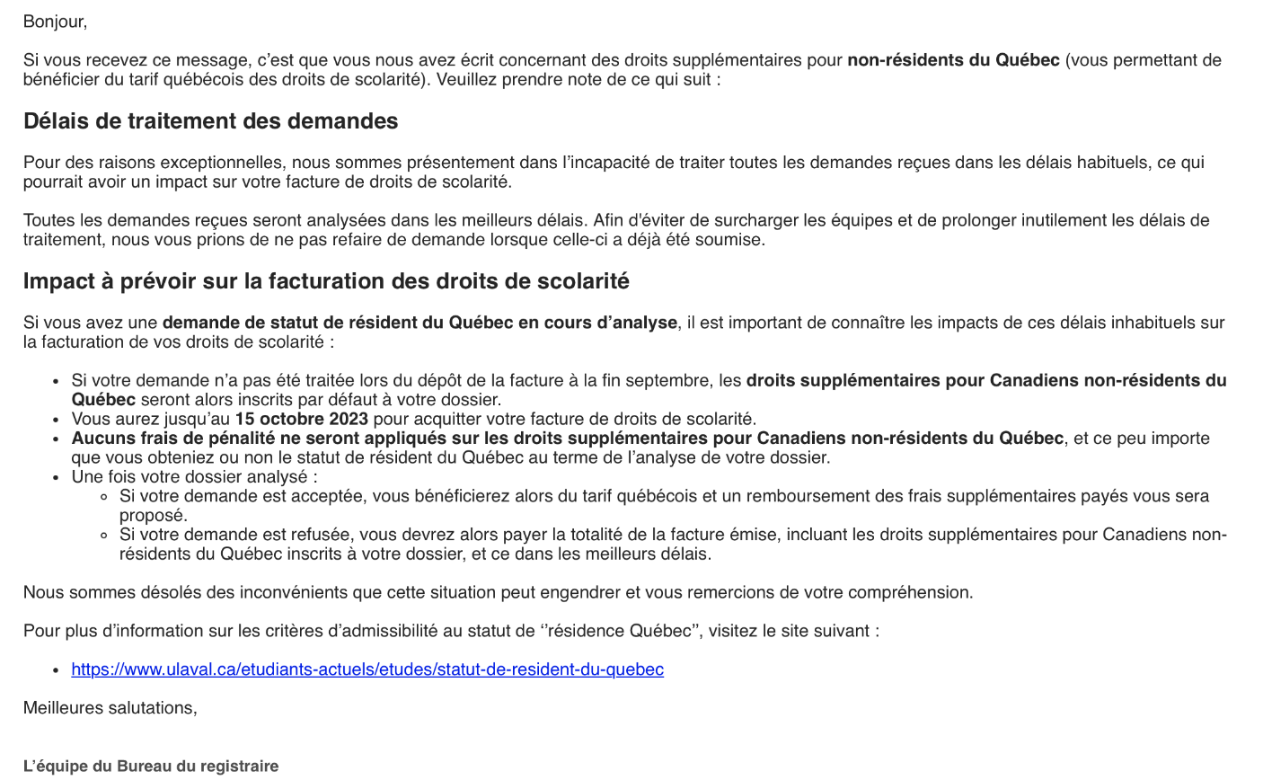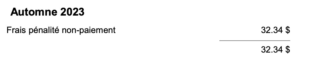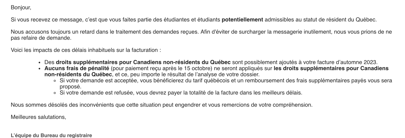 | Du 6 septembre 2023 au 8 novembre 2023 | Depuis le 6 septembre 2023 jusqu’au 8 novembre 2023, j’ai dû me rendre une fois par semaine, après mon cours du jeudi après-midi, au Bureau du registraire, prendre un numéro et attendre mon tour dans la salle d’attente afin de rencontrer un agent pour lui expliquer qu’on m’avait facturé des frais comme non-résidente du Québec d’un montant de 1833,30 $ pour un total de 3514,35 $. Pourtant, je suis citoyenne canadienne depuis mars 2007 et j’ai la résidence permanente depuis le 4 février 2003. Comme résidente, le montant à payer était de 1769,17 $ pour la session. Chaque fois, je leur montrais mes preuves de statut (ma carte de citoyenneté et mon passeport), ils l’inscrivaient dans mon dossier et, en plus, je les leur envoyais également par courriel. En outre, en fouillant dans mon dossier pour essayer de les aider à trouver le problème, j’ai remarqué que quelqu’un avait inscrit, par erreur, dans la section Résidence : Citoyen canadien (Hors Québec). Eurêka ! Cependant, bien que je leur aie fait part de l’erreur, je continuais de recevoir, semaine après semaine, le message suivant : ![]() Finalement, le 12 septembre, j’ai réussi à parler avec une autre personne du Bureau du registraire, quelqu’un des « coulisses ». Je lui ai expliqué ma situation et le fait que je n’avais pas les moyens de payer 3514,35 $. Elle m’a donc dit de payer seulement les frais de 1703,05 $ pour la session. Néanmoins, je voulais m’assurer qu’on n’allait pas me pénaliser si jamais mon problème de statut n’était pas réglé avant la date limite de paiement, soit le 15 octobre. Et elle m’a rassurée. |