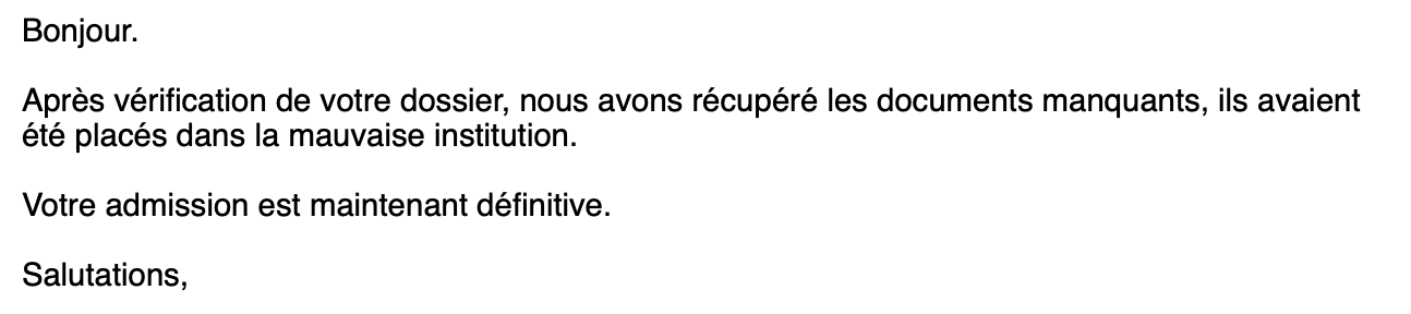 | 27 septembre 2023 | Je reçois enfin l’offre d’admission définitive. Toutefois, mon cauchemar n’était pas encore terminé. |