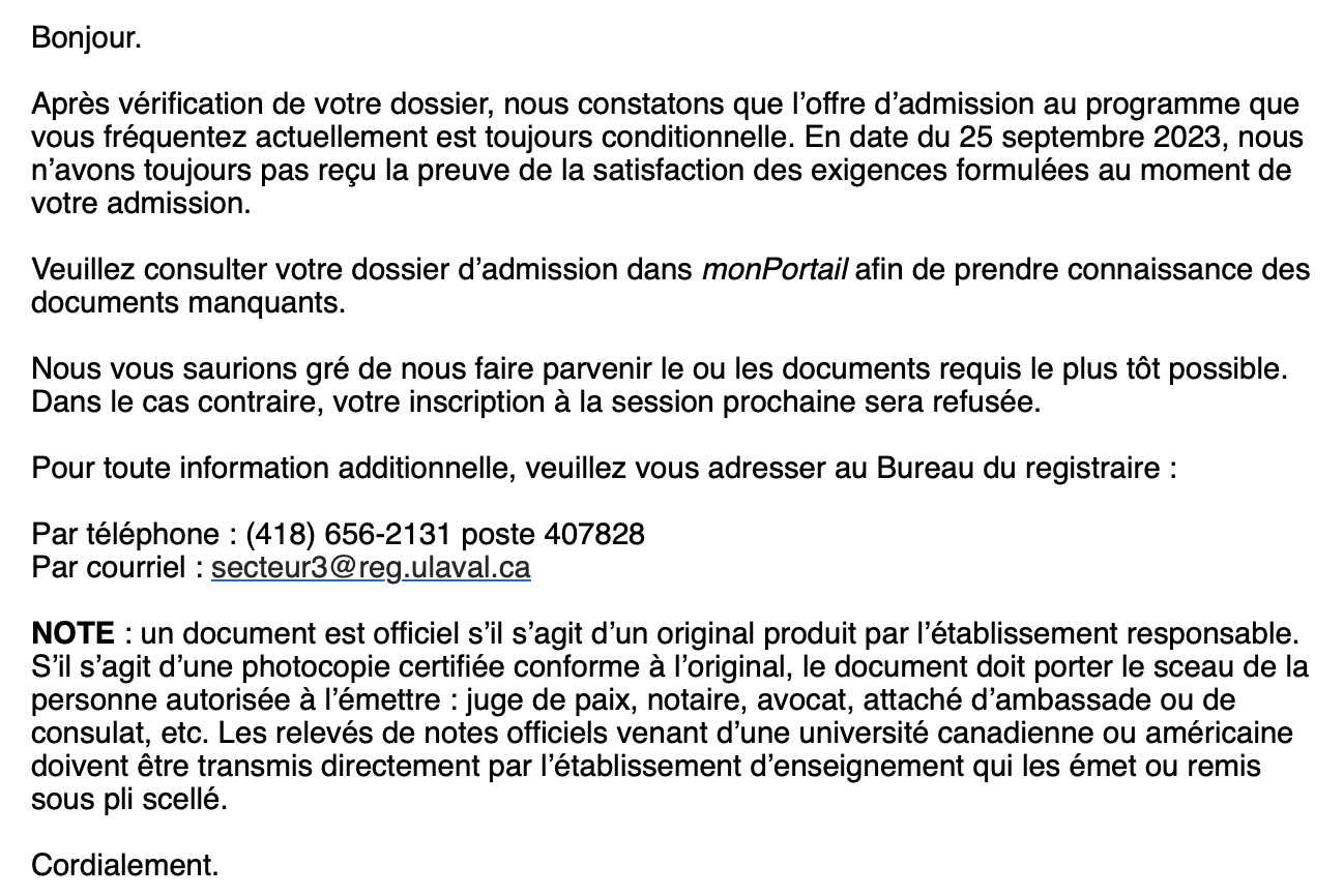 | 26 septembre 2023 | Courriel du Bureau du registraire le matin, 20 jours après le début de la session : ![]() Je ne comprenais plus rien. J’avais remis en mains propres les originaux de mon relevé de notes du secondaire et de mon diplôme de premier cycle universitaire de l’Argentine. Une personne du Bureau du registraire les avait photocopiés ou numérisés, mais je ne l’ai pas vu faire parce qu’elle est allée en arrière du comptoir d’accueil. Par la suite, elle me les a remis. Voici la réponse reçue du Bureau du registraire à 14 h 19 après avoir passé une journée au téléphone en essayant de leur expliquer que j’avais présenté les originaux et non pas des copies, et que j’y étais allée personnellement. Malgré toutes mes explications et toute ma patience, la personne ne me croyait pas. Je lui ai donc dit que je me présenterai à nouveau au Bureau du registraire après mon cours le lendemain matin avec les documents originaux en main. ![]() Comment cela était possible ? Je m’étais pourtant rendue personnellement avec les originaux de mes relevés de notes et diplômes au Bureau du registraire de l’institution où je m’étais inscrite, un agent les a numérisés ou photocopiés. Comment était-il possible qu’ils aient été placés dans UNE AUTRE INSTITUTION ?!? Allez savoir… |