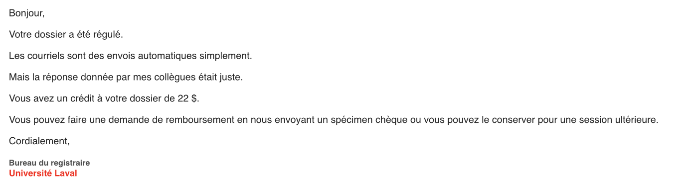 | 6 avril 2023 | Courriel d’admission reçu![]() Le seul hic dans ce beau message est que le cheminement reçu est le même que pour n’importe quel étudiant qui commence son Baccalauréat en enseignement du français, langue seconde. Alors, que dois-je faire ? À quels cours dois-je m’inscrire ? Quel est mon cheminement particulier ? Toujours aucune idée. |